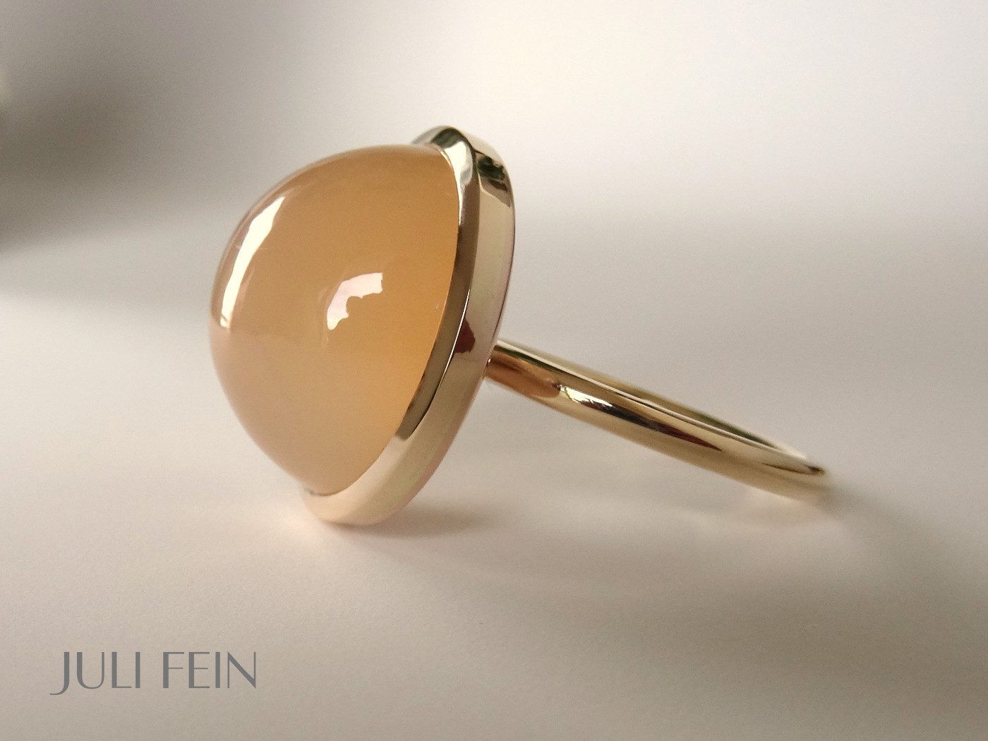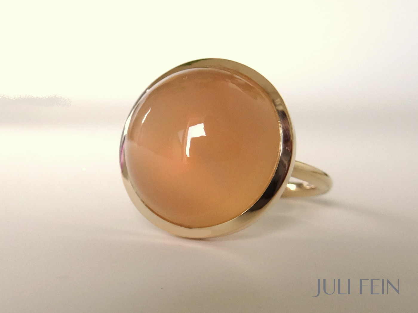 Im Mittelpunkt ein handverlesener Mondstein mit einem zarten aprikosenfarbenen Leuchten