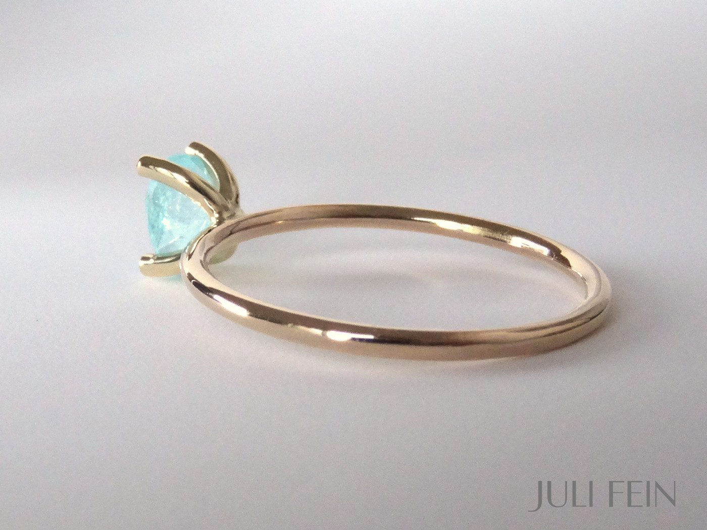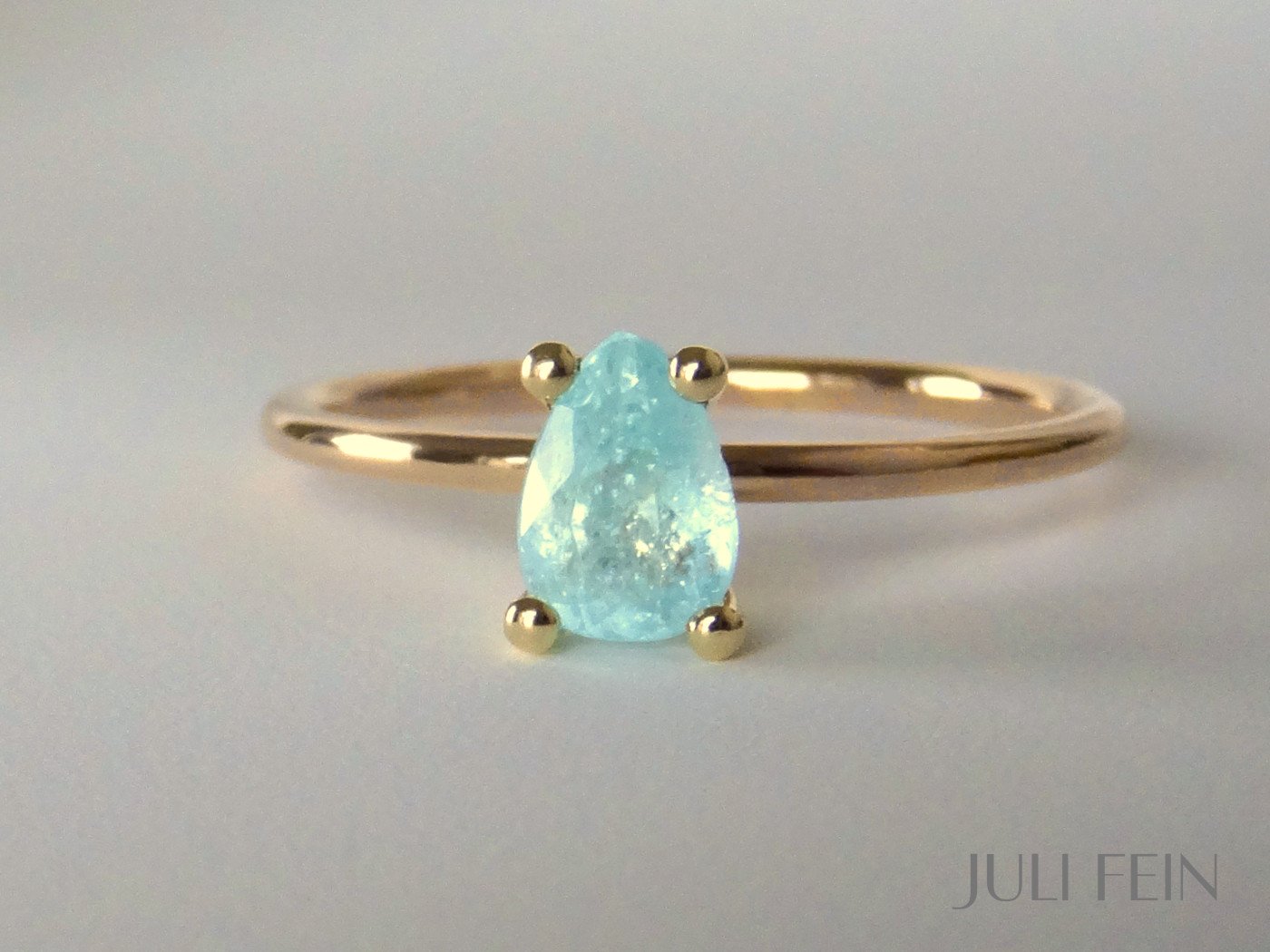 Die schlichte Fassung aus hochwertigem 14 Karat Gelbgold unterstreicht die Leuchtkraft des Paraíba-Turmalins, ohne von ihm abzulenken.